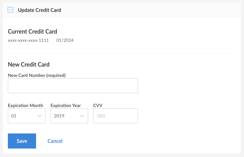 Expand the Update Credit Card box and enter your credit card number and the card’s expiration date.