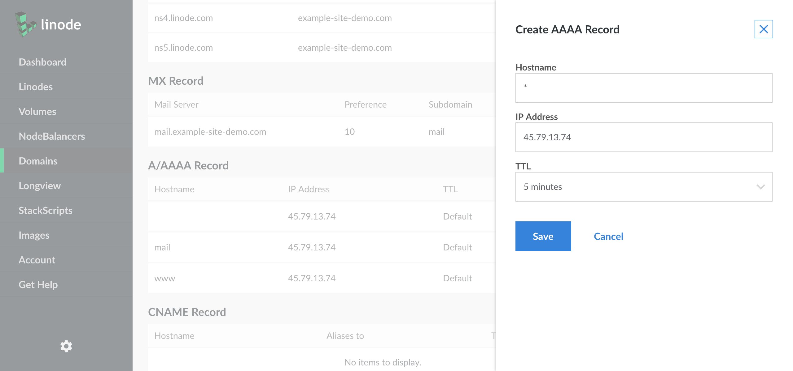 ![The SOA record is set to “example-site-demo.com”. The NS records are set to “ns1.linode.com” through “ns5.linode.com”, inclusive. The MX record is set to “mail.example-site-demo.com”. There are A records for [blank], which is the primary domain, and the “mail” and “www” subdomains. They are all set to the same IP. The SOA record is set to “example-site-demo.com”. The NS records are set to “ns1.linode.com” through “ns5.linode.com”, inclusive. The MX record is set to “mail.example-site-demo.com”. There are A records for [blank], which is the primary domain, and the “mail” and “www” subdomains. They are all set to the same IP.](/docs/guides/common-dns-configurations/common-dns-set-up-a-domain_hu4018074edfc0204eb738a69780e12428_416000_2560x0_resize_q71_bgfafafc_catmullrom_2.jpg)