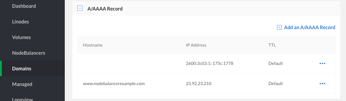 Edit or create an A record for your website’s domain name, pointing to your NodeBalancer’s IP address.