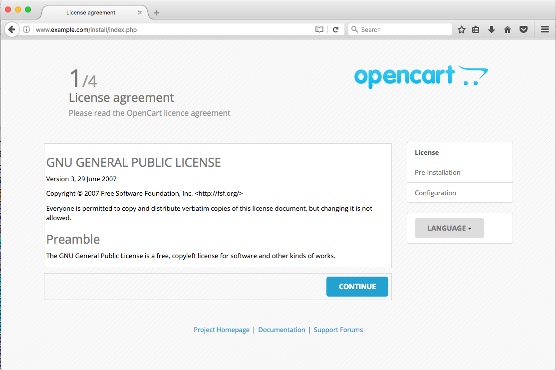 Make sure that you see the green checkmark for every section before proceeding. If you see any red marks, please go back and make sure all of the instructions in this guide were followed properly. Once you’ve confirmed that every section has a green checkmark, press the CONTINUE button to see the OpenCart configuration page:
