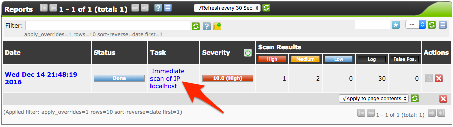 To view the details of a specific task, click its name under “Task.” In the example below, it was called “Immediate scan of IP localhost” when we created it with the Task Wizard: