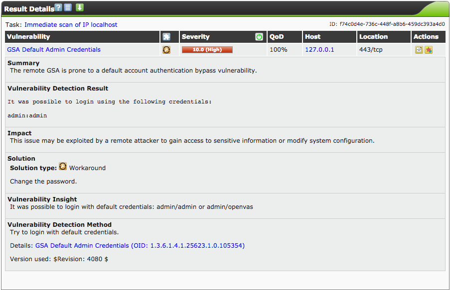 To view details of a vulnerability, such as the method of detection, impact to your system, and in some cases a solution, click the name of the vulnerability. In the example below, OpenVAS has detected that we haven’t changed the default login credentials, and it tells us how to resolve the issue: