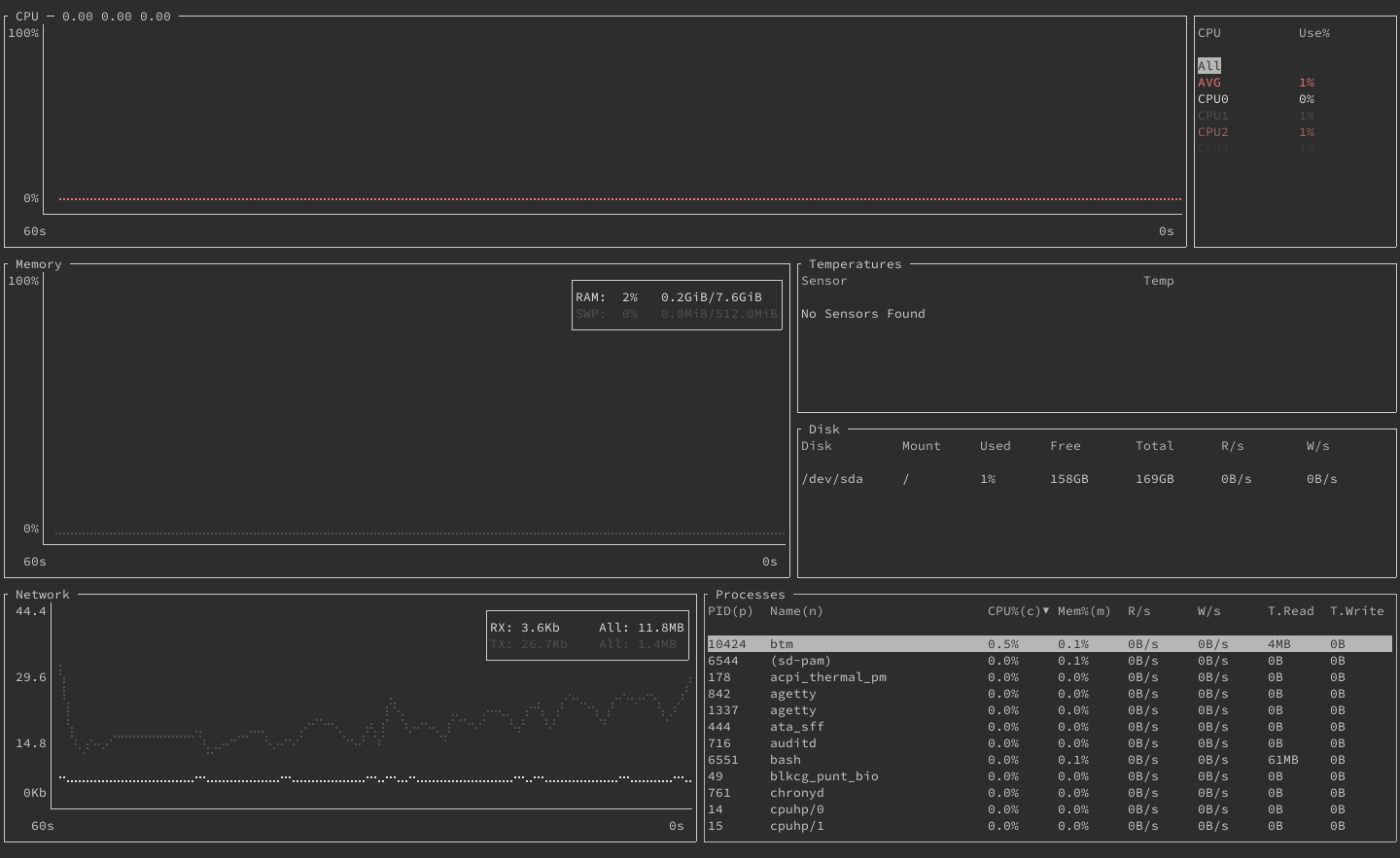 In short, bottom is a good choice if you want a graphical system monitoring dashboard that gives you control over every detail of the display. Gtop is a good option if you want uncomplicated system monitoring and find the default display useful.