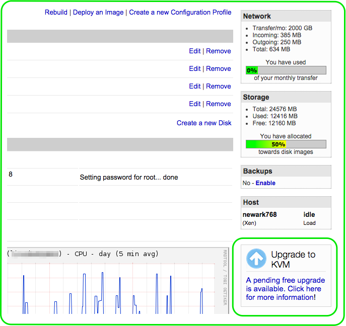 If your Linode is currently running on Xen, go to the Linode’s Dashboard page. In the bottom right of the sidebar is an “Upgrade to KVM” link. Click on the link and follow the instructions to upgrade: