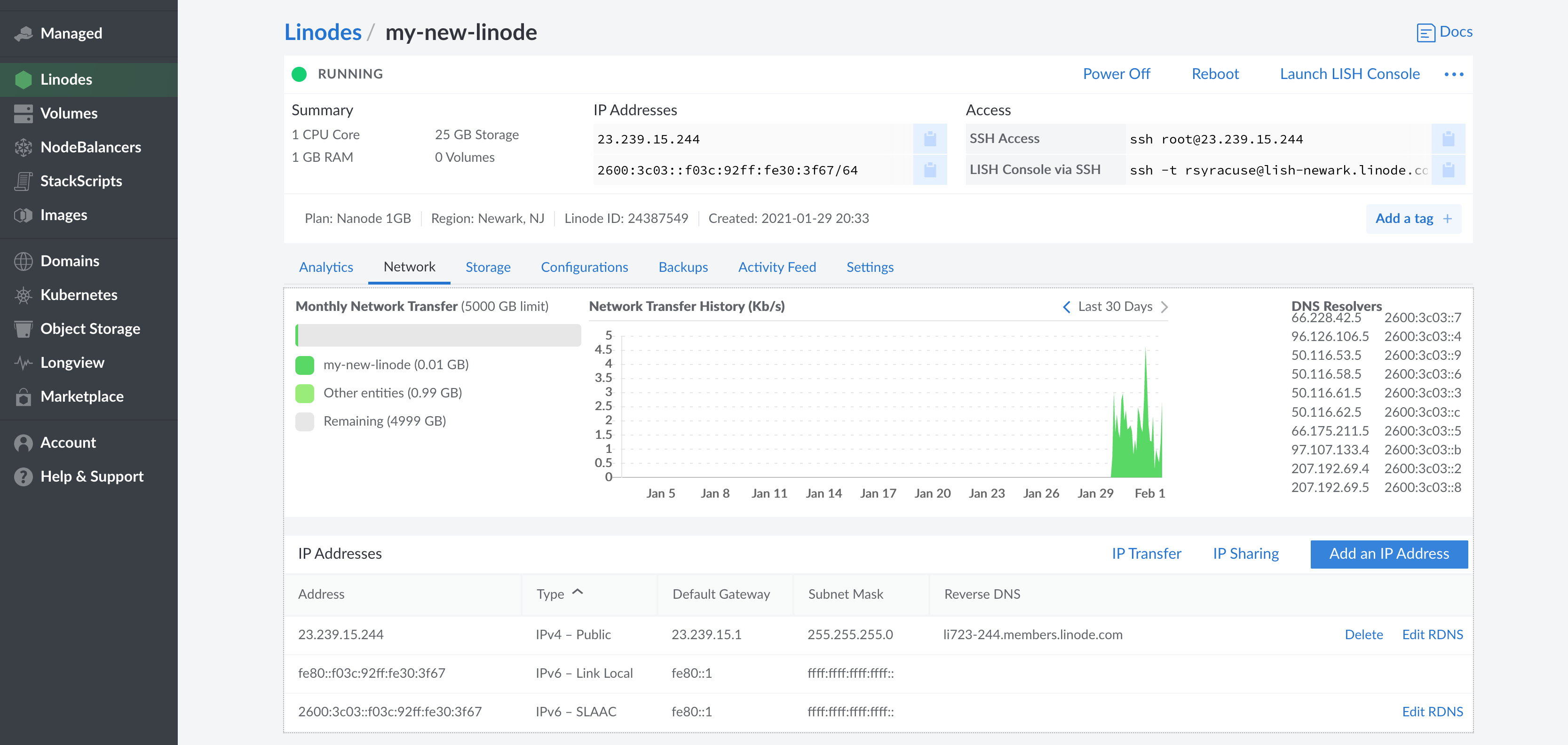 To find the networking information for each of your Linodes in your Linode Manager, click on the Linodes tab to the left of the page, select the Linode you’ll be configuring, then click on the Networking towards the top.