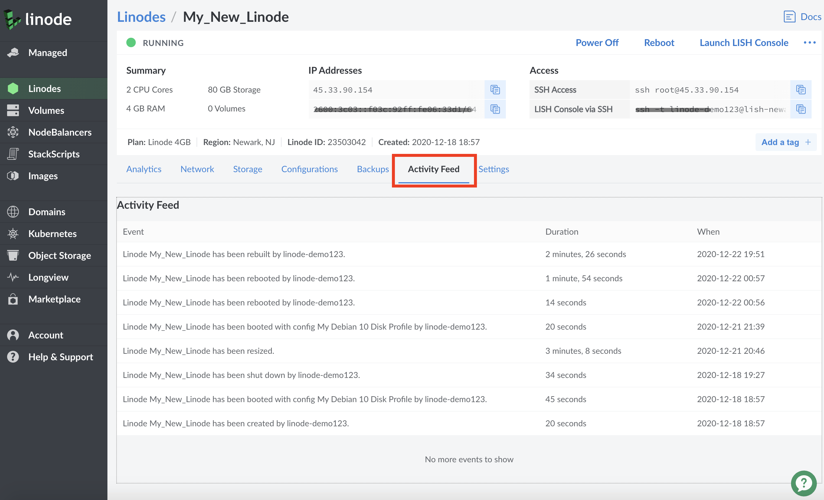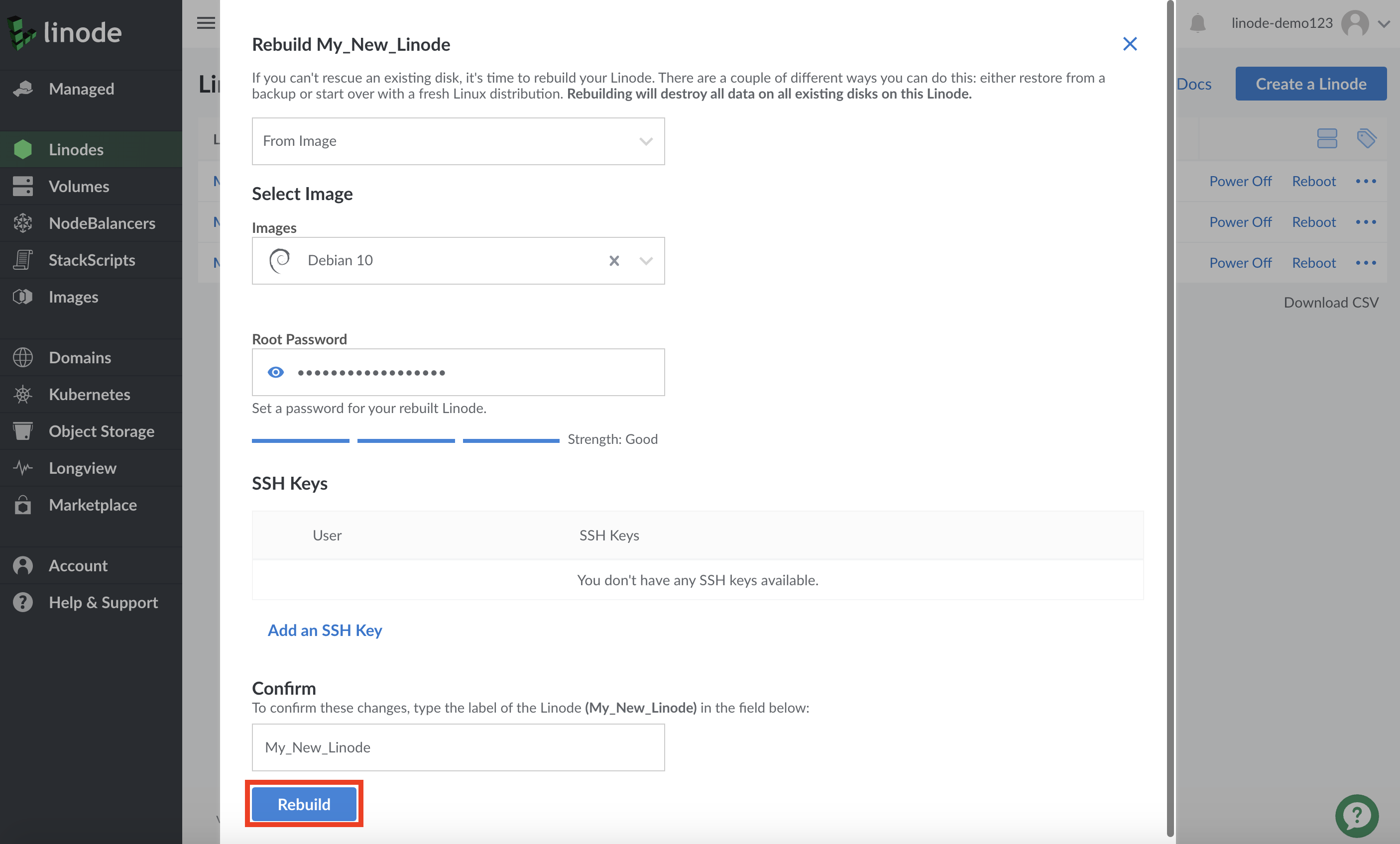 The Linode may take several minutes to complete the rebuild process. Select the Linode that is being rebuilt and select the