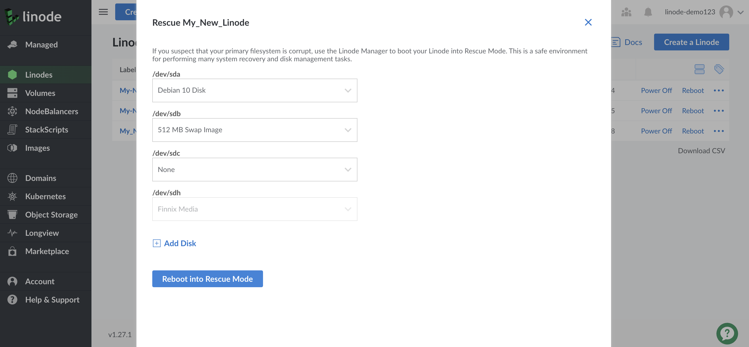 Rescue Mode is a safe environment for performing many system recovery and disk management tasks. Rescue Mode is based on the Finnix recovery distribution, a self-contained and bootable Linux distribution that you can mount the disks of Linode from. You can also use Rescue Mode for tasks other than disaster recovery, such as:
