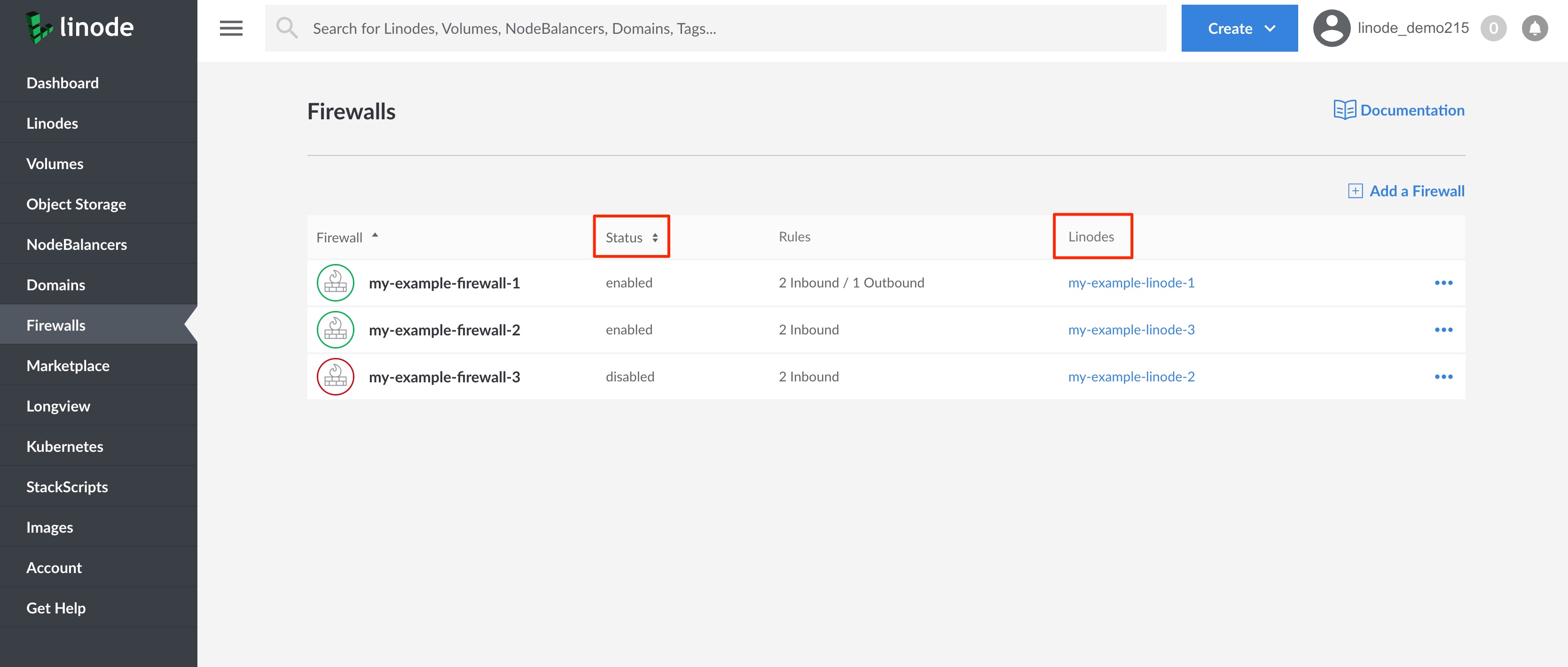 Find the Linode you are troubleshooting under the Linodes column to determine which Cloud Firewall(s) is assigned to it.