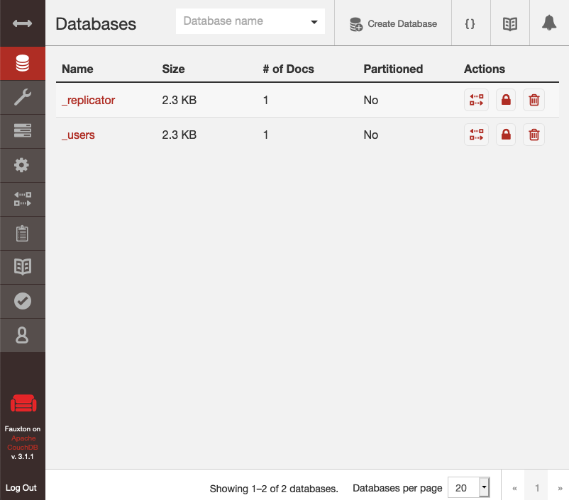 Once you have logged into Fauxton, you are presented with a list of your CouchDB databases. Initially, this should only contain a