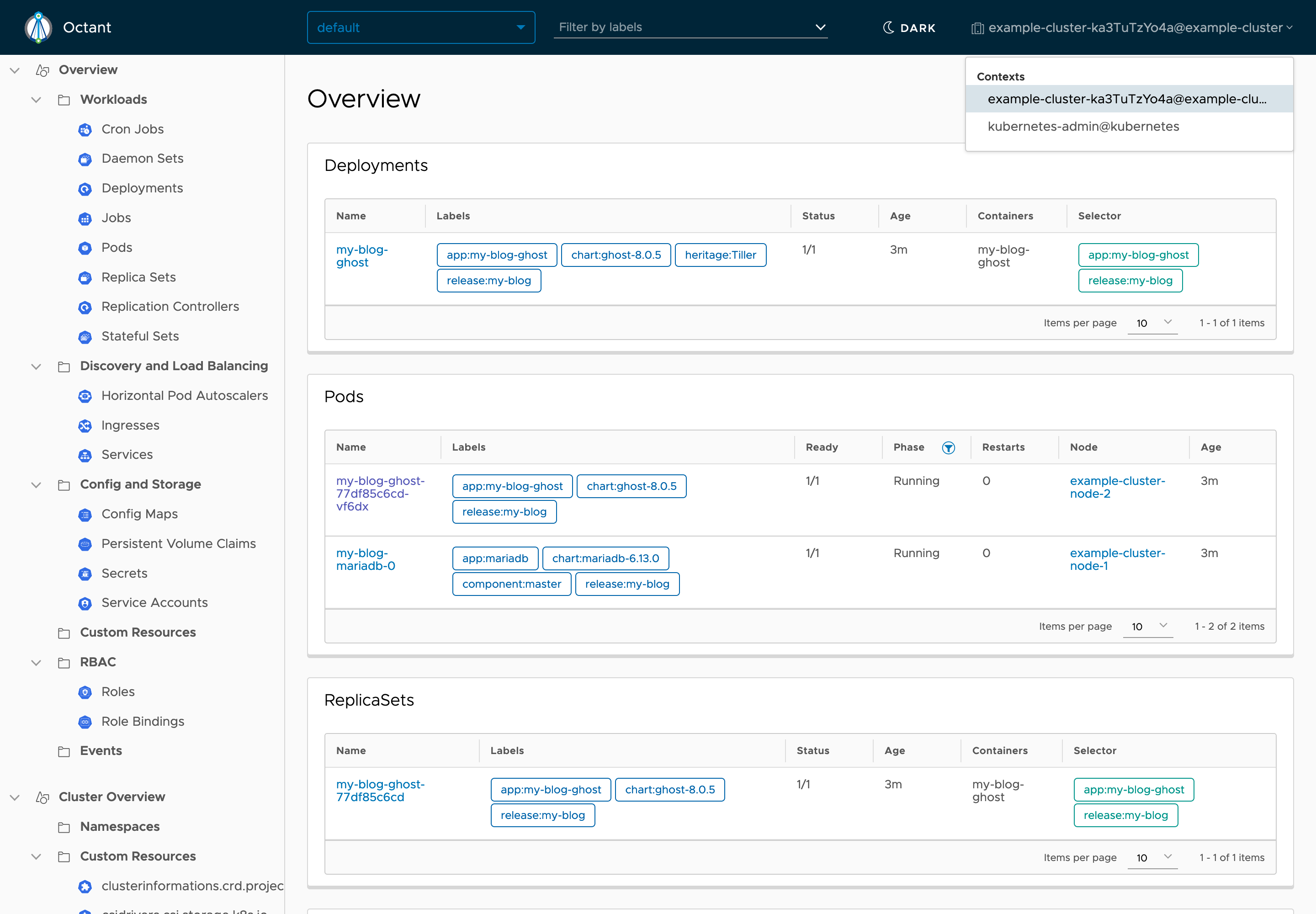 NoteThe cluster objects visible in the following screenshots were created by installing the Helm chart for the Ghost blogging software. The How to Install Apps on Kubernetes with Helm 2 guide outlines how to install this software. Please note that this guide uses Helm 2 and not Helm 3 to install the software.