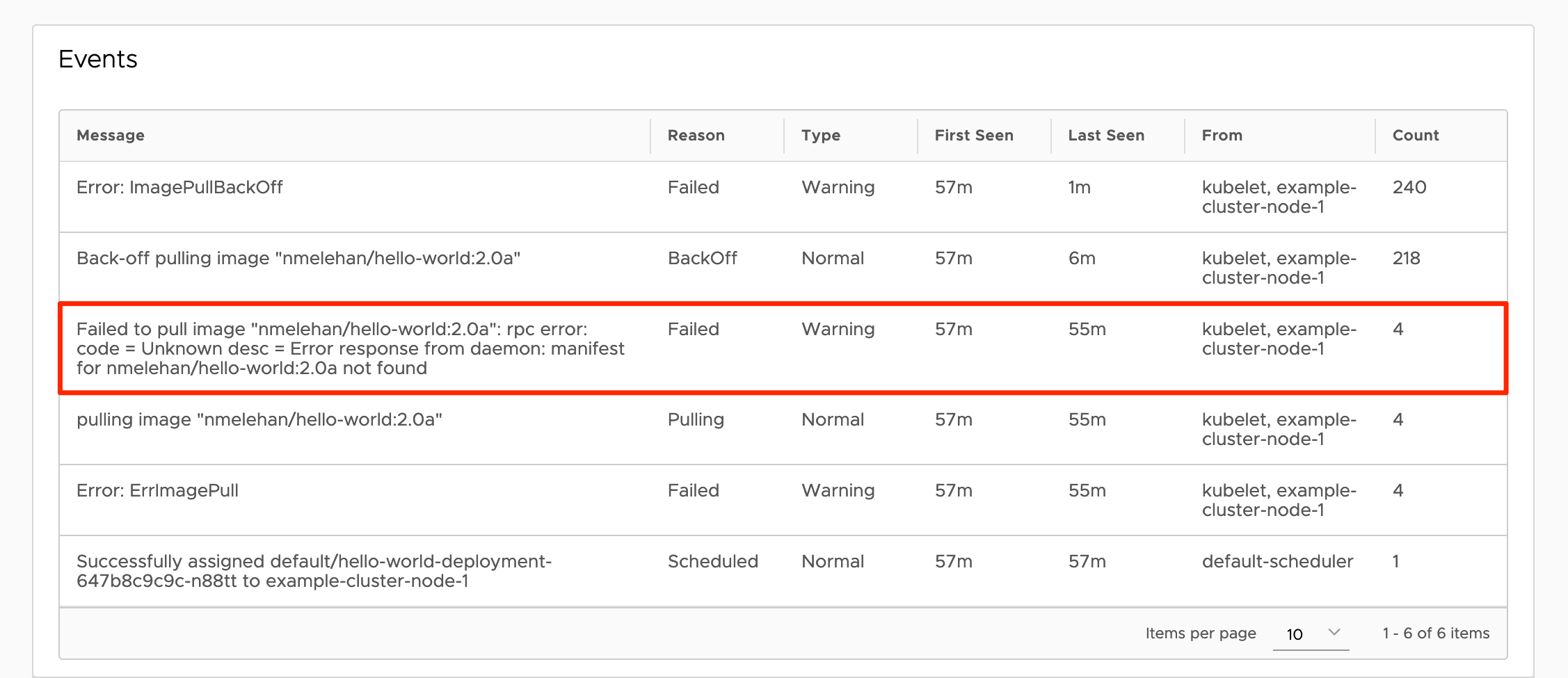 The detail view for the Pod will appear. Scroll down to the Events table at the bottom. A