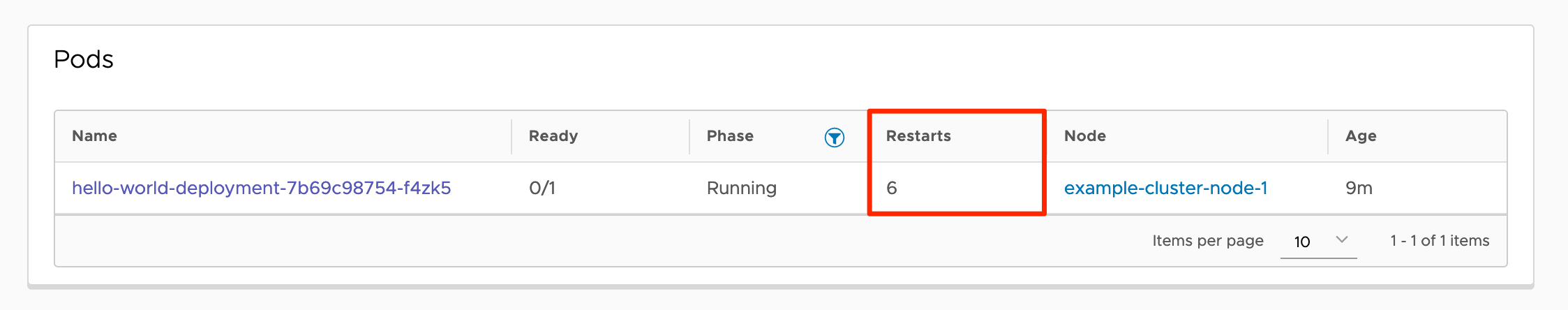 The detail view for the ReplicaSet will appear. The Pods panel on this page will show that the Pod has restarted several times: