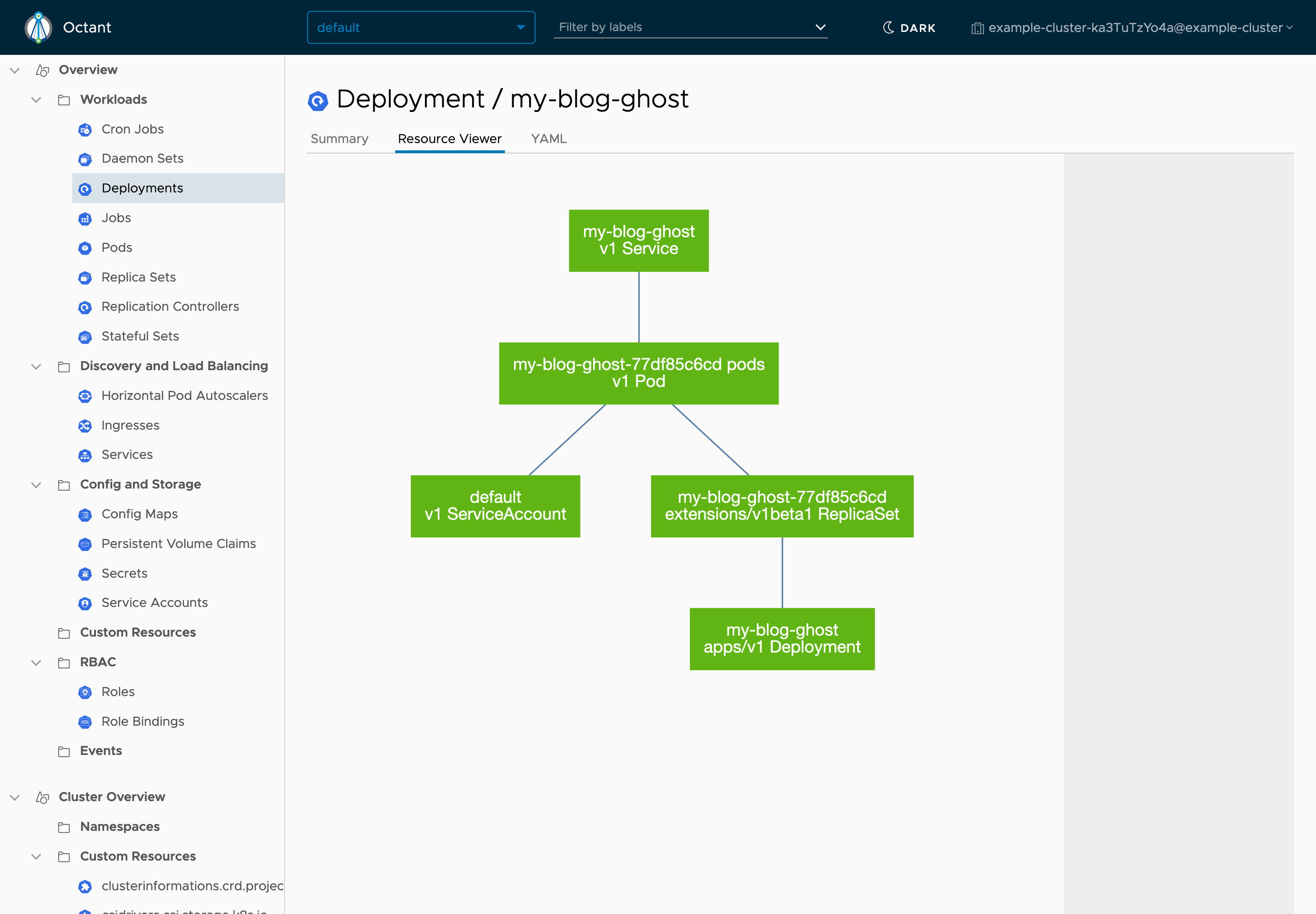 Other panels will appear for different object types. For example, Pods will show container environment variables, Volume mounts, node resources requests and limits, and taints, among other information.The Resource Viewer tab will reveal the object relationship graph for this Service:
