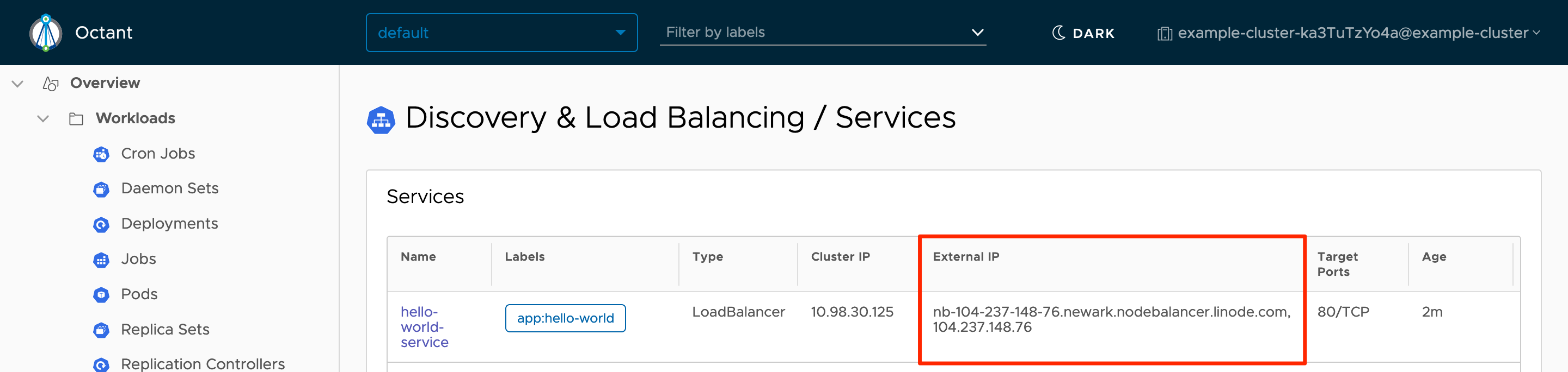 hello-world-serviceobject:The external IP address for the Service will also be shown in the new table entry (highlighted above). Visiting this address in your browser will return the “Hello World” message as expected.