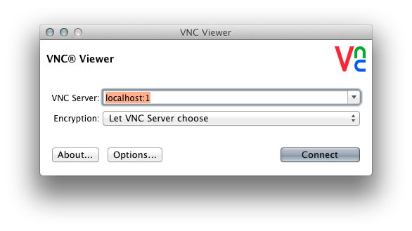 Create a new remote desktop profile. Name your profile, specify the VNC protocol, and enter localhost :1 in the server field. Be sure to include the:1in theServersection. In the password section fill in the password you specified in Secure your VNC connection:Press Connect.