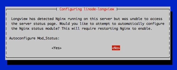 dpkg-reconfigure -phigh linode-longviewFor most people, this will prompt a popup asking whether you would like Longview to attempt an automatic configuration of the NGINX status module.